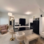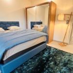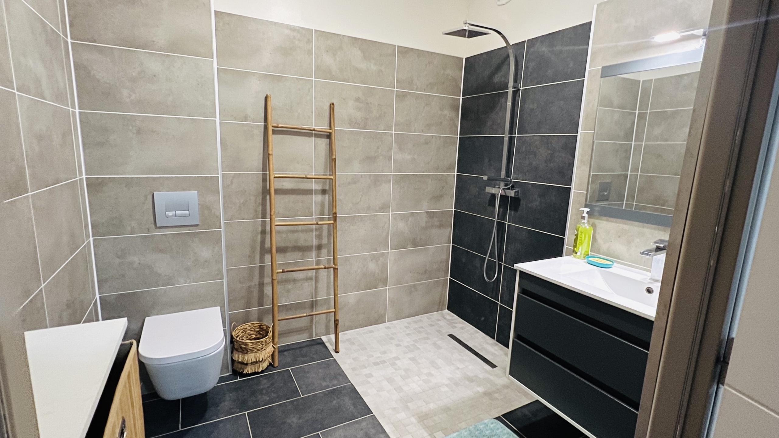 Une chambre pour 2 personnes, un canapé lit 2 places, une cuisine équipé et une salle de bain avec douche à l’italienne et son meuble double vasque, un wc.