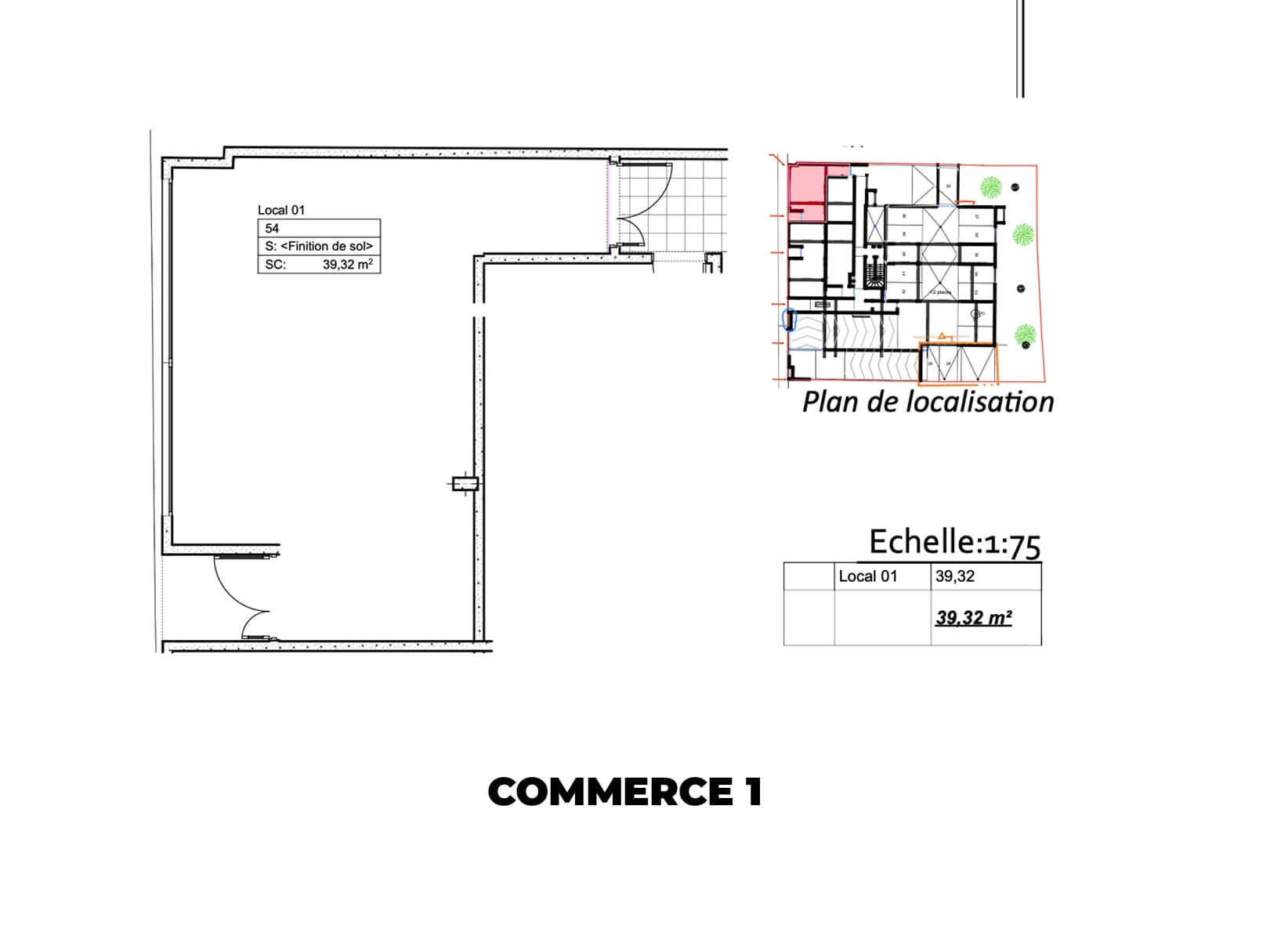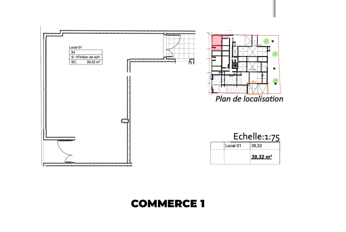 Commerce 1 : Une surface fonctionnelle de 39,32 m², idéale pour une activité de services, un bureau ou une boutique spécialisée.