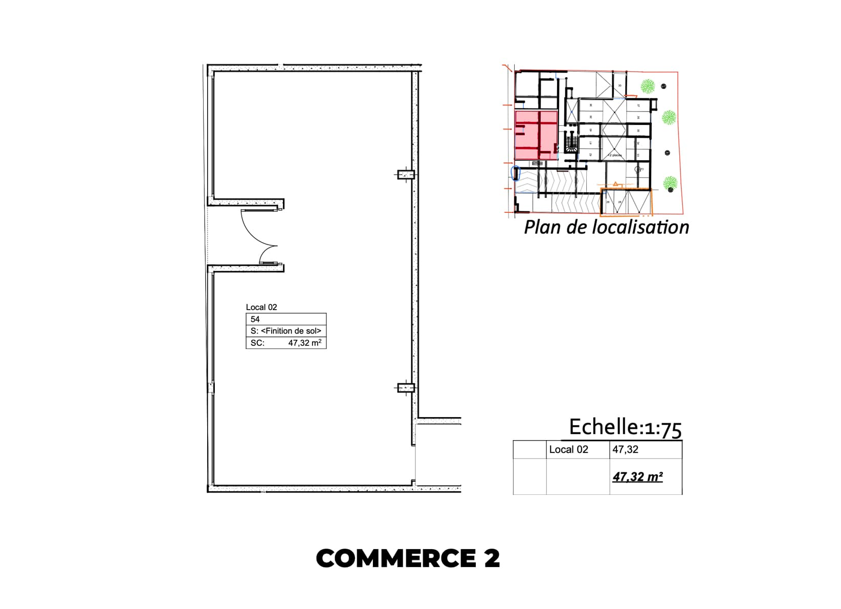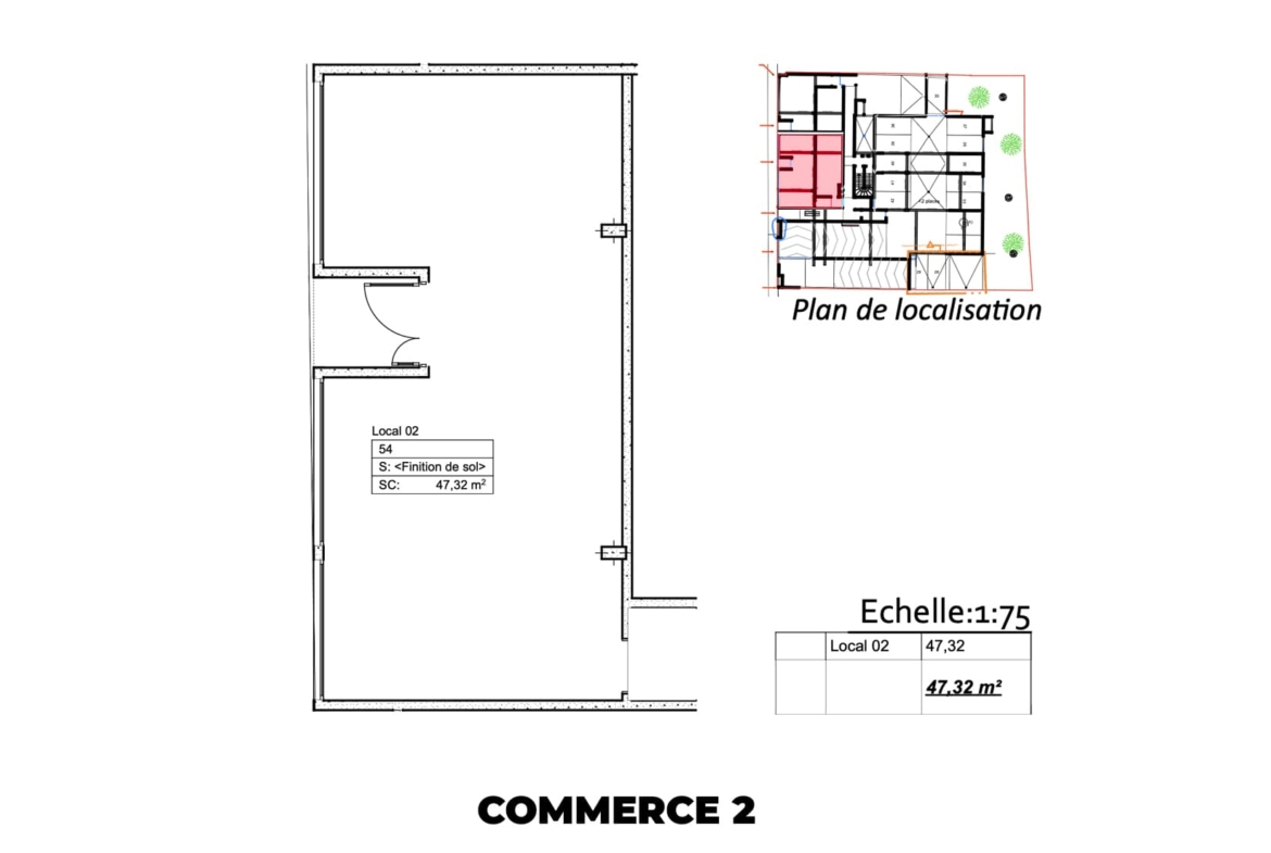 Commerce 2 : Un espace plus spacieux de 47,32 m², offrant une belle largeur de vitrine et de multiples possibilités d’aménagement.